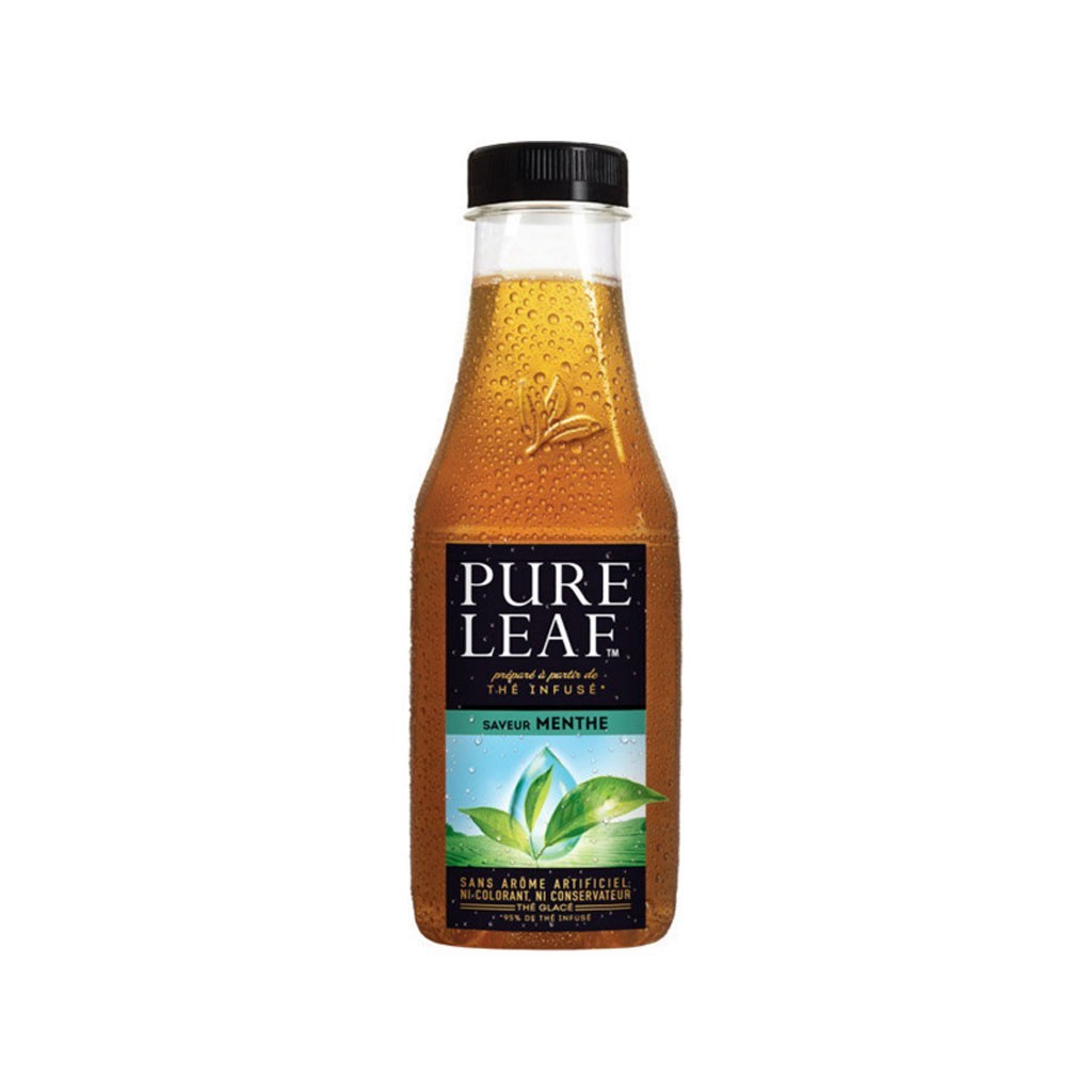 Boisson rafraîchissante au thé infusé et aromatisée menthe avec sucre et édulcorant d'origine naturelle.