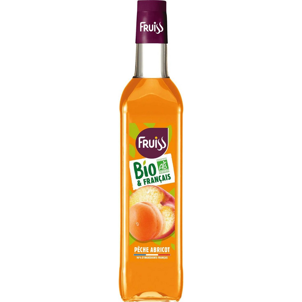 Sirops de la marque Fruiss. Sucre* **, eau**, jus de pêche à base de concentré* 6.3% (eau**, jus concentré de pêche*), jus d'abricot à base de concentré* 3.7% (eau**, jus concentré d'abricot*), acidifiant: acide citrique, arôme naturel d'abricot, arôme naturel, caramel aromatique* (sucre*, eau). * Ingrédients issus de l'agriculture biologique **Ingrédients d'origine française. EAN 3217690057628.