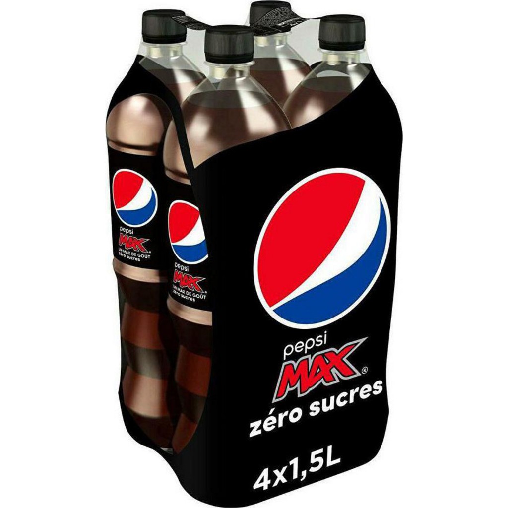 Sodas de la marque Pepsi Max [pack de 4]. Boisson gazeuse au cola zéro sucres 4 x 1,5 L. EAN produit unitaire: 3502110009357. EAN pack de 4: 3502110009371.
