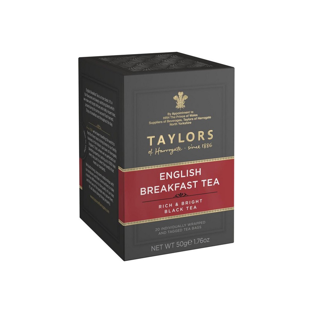 TAYLORS OF HARROGATE Thé noir Anglais breakfast (la boite de 40 sachets). détaillés sur l'emballage extérieur.