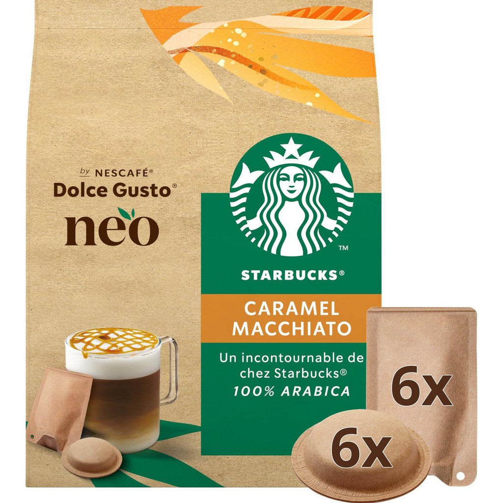 Cafés de la marque Starbucks. NEO NESCAFE DOLCE GUSTO NEO Café dosettes Compatibles Dolce Gusto NEO caramel macchiato 100% arabica NESCAFE DOLCE GUSTO NEO ( 6 dosettes et de 6 sachets) SACHS L. EAN 8445290511164.