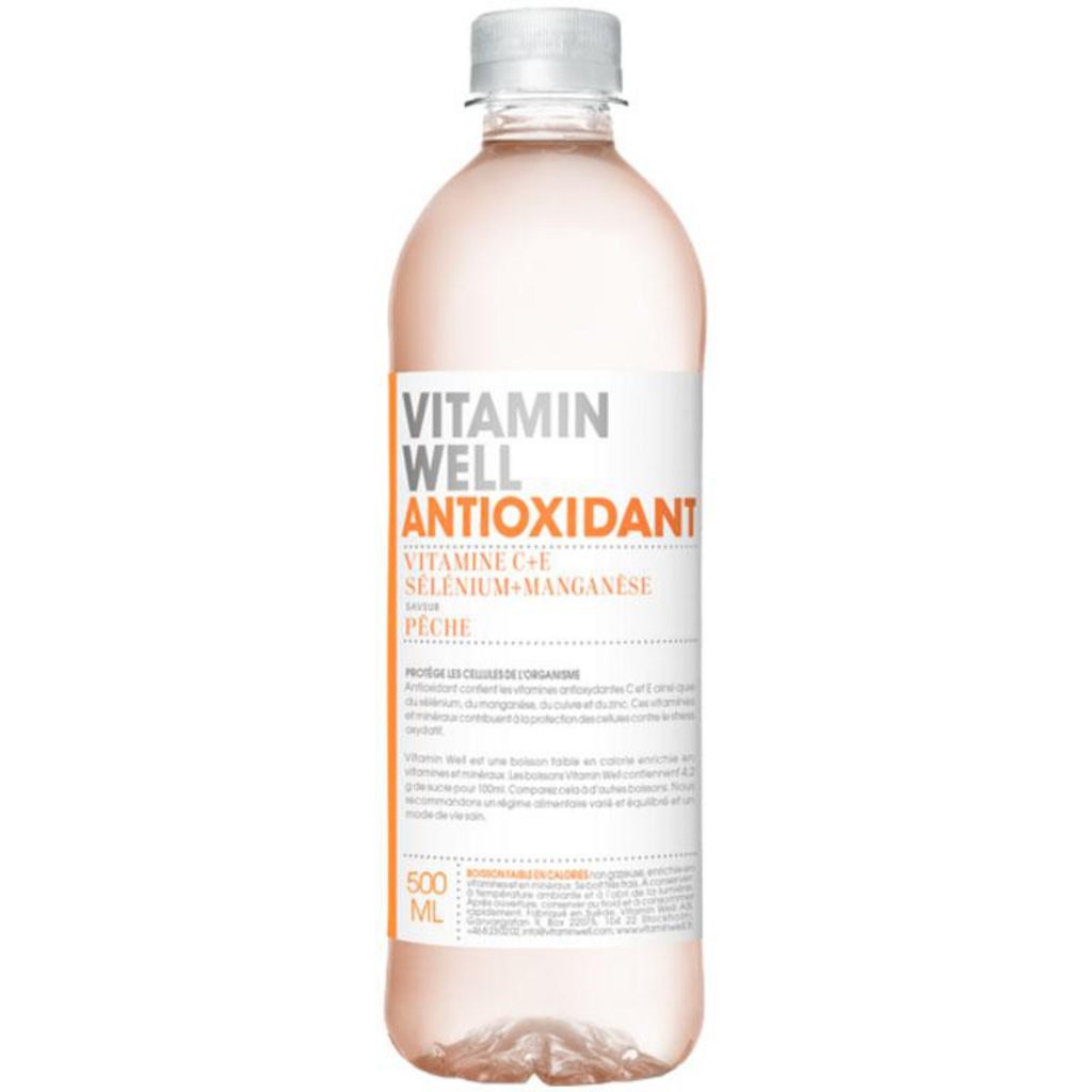 Antioxidant contient les vitamines antioxydantes C et E ainsi que du sélénium, du manganèse, du cuivre et du zinc. Ces vitamines et minéraux contribuent à la protection des cellules contre le stress oxydatif. Vitamin Well est une boisson faible en calorie enrichie en vitamines et minéraux.. Eau, fructose, correcteurs d’acidité (acide citrique, citrate de sodium), extrait de thé vert , extrait de sureau, extrait de peau de raisin, extrait de grenade, vitamines (E, C), minéraux (zinc, cuivre, manganèse, sélénium), conservateur (sorbate de potassium), arôme pêche.